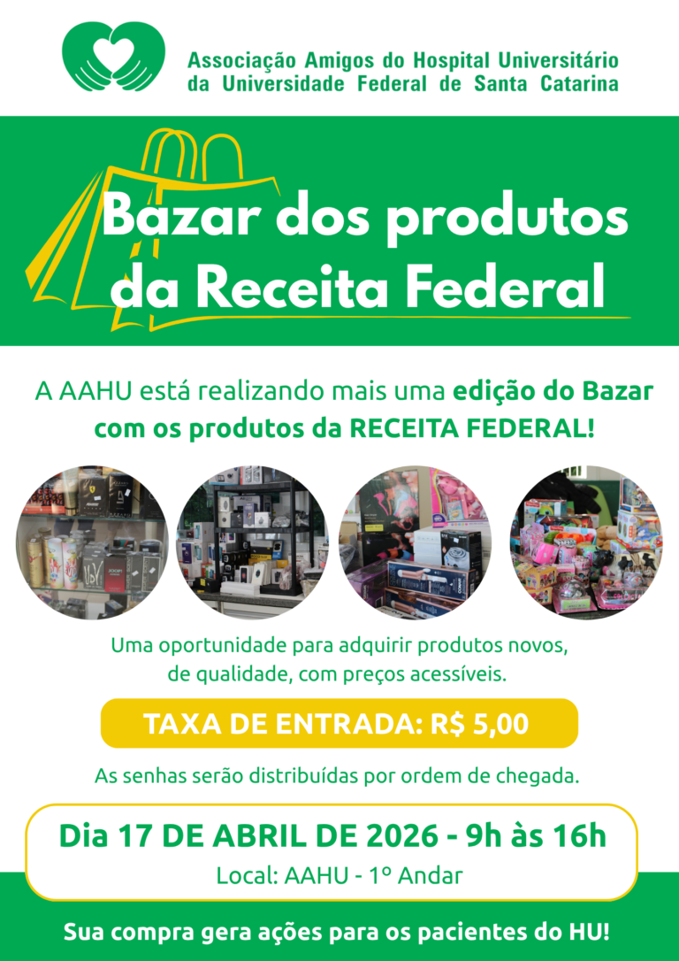 A Associação Amigos do Hospital Universitário (AAHU) realizará, nos dias 06, 07,08, 09 e 10